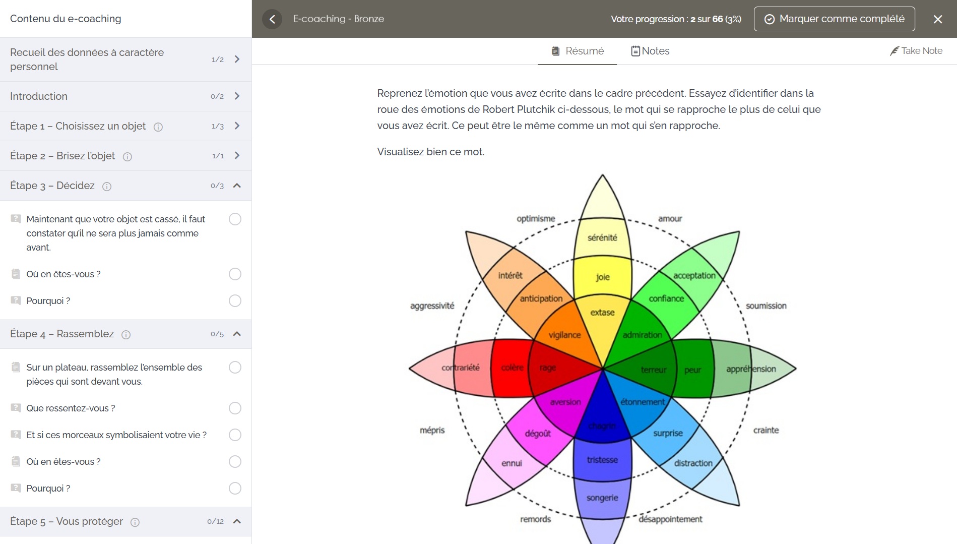 Conçue avec l’appui et la validation d’une psychologue clinicienne, notre plateforme de E-coaching comporte :